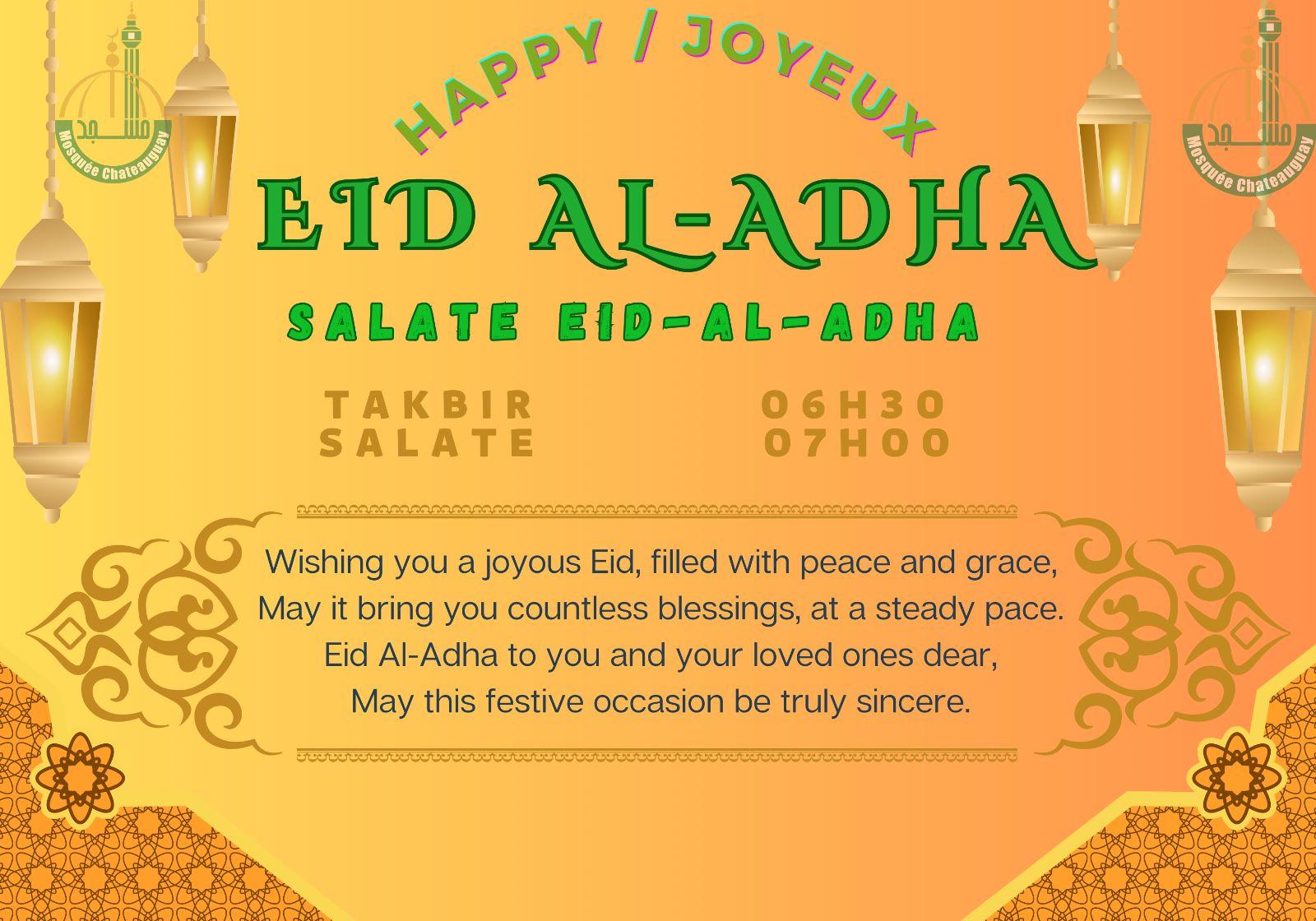 Eid Mubarak Said by admin Posted in Accueil, Activités on 2023-06-252023-06-25 Mosquée Châteauguay vous souhaite joyeuse et heureuse occasion de fête Al-Adha, et que Allah accepte vos bonnes œuvres,